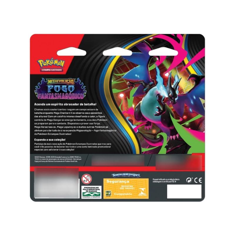 Chamas azuis cauterizantes rasgam um campo escuro de batalha enquanto Mega Charizard X ex observa seus oponentes das alturas! Com um calafrio intenso desafiando o calor, a figura sombria de Mega Gengar ex emerge lentamente, e os dois Pokémon se preparam para o combate. Dispostos a provar sua força, Mega Heracross ex, Mega Lopunny ex e muitos outros Pokémon se alinham para dar tudo de si na expansão Megaevolução — Fogo Fantasmagórico do Pokémon Estampas Ilustradas!
