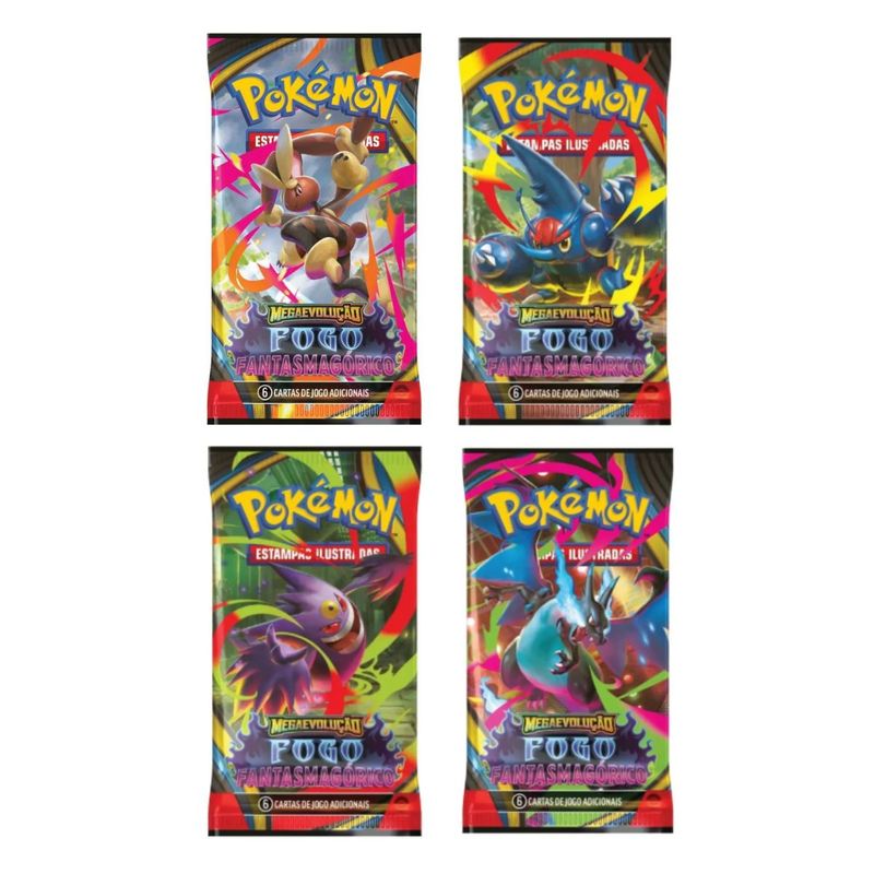 Conteúdo: 01 blister quadruplo Mega Evolução Fogo Fantasmagórico Pokémon Trading Card Game, contendo 125 cartas, dentre elas 1 carta holográfica promocional Weavile.