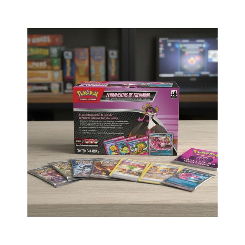 Conteúdo: 01 Box Ferramentas de treinador, contendo 94 cartas no total, incluindo mais de 50 cartas poderosas para fortalecer baralhos; 6 pacotes de booster do Pokémon Estampas Ilustradas; 5 cartas promocionais, 3 cartas ACE SPEC e 1 cópia de Fezandipiti ex; 1 guia de estratégia e um código para o jogo online Pokémon Estampas Ilustradas Live.