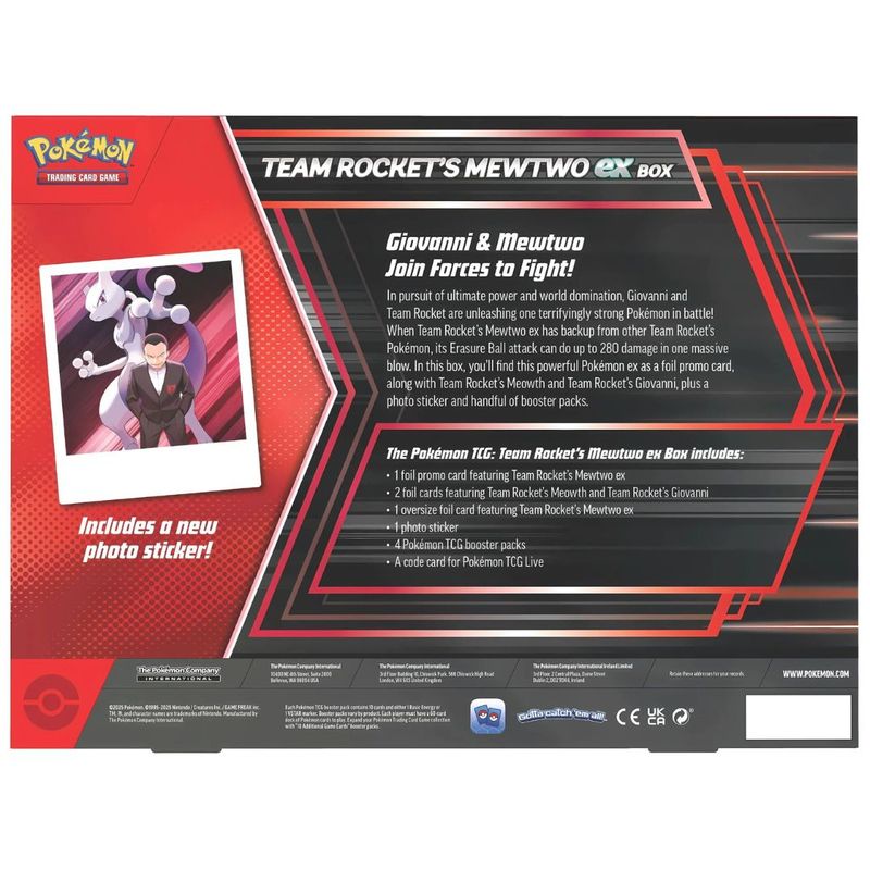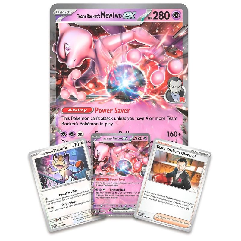 Giovanni e Mewtwo unem forças para lutar! Em busca do poder supremo e da dominação mundial, Giovanni e a Equipe Rocket estão liberando um Pokémon terrivelmente forte na batalha! Quando o ex Mewtwo da Equipe Rocket tem reforços de outros Pokémon da Equipe Rocket, seu ataque Bola de Apagamento pode causar até 280 de dano em um único golpe. Nesta caixa, você encontrará este poderoso ex Pokémon como uma carta promocional foil, juntamente com Meowth e Giovanni da Equipe Rocket, além de um adesivo com foto e alguns pacotes de reforço.