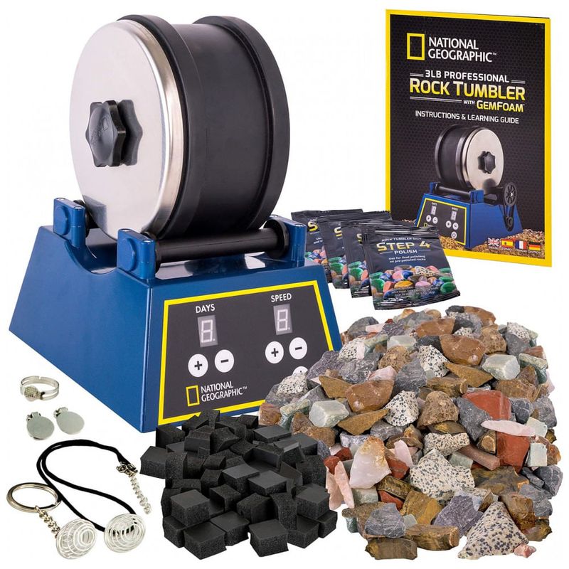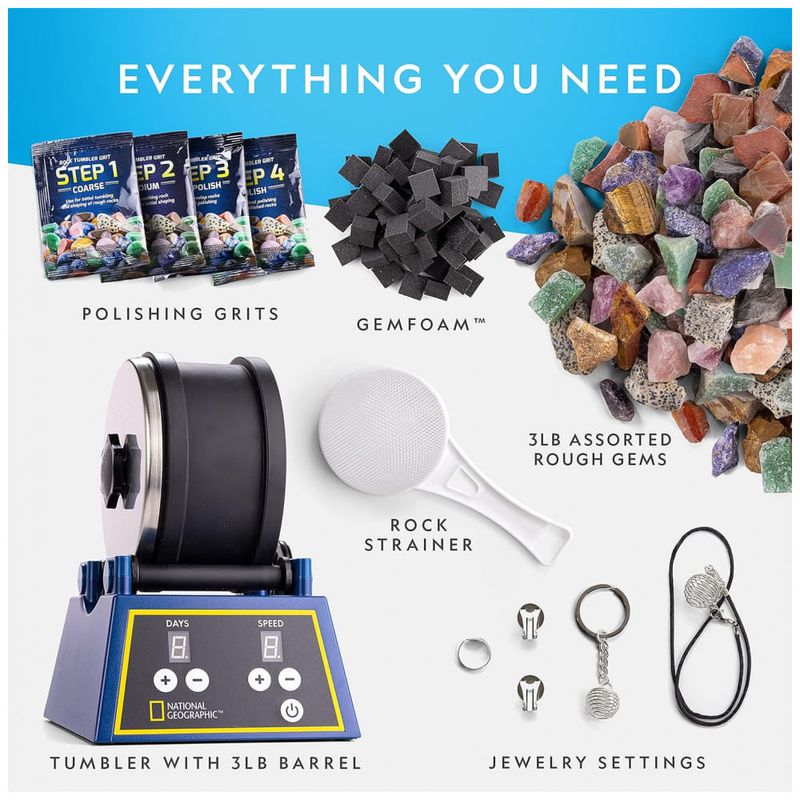 Este kit de tombamento vem com tudo que você precisa de 1,5 kg. de rochas brutas com 9 tipos de pedras preciosas, 5 fechos de joias, grão, filtro GemFoam para um brilho deslumbrante
