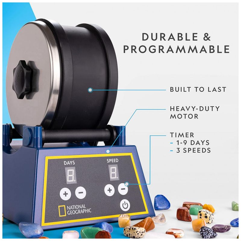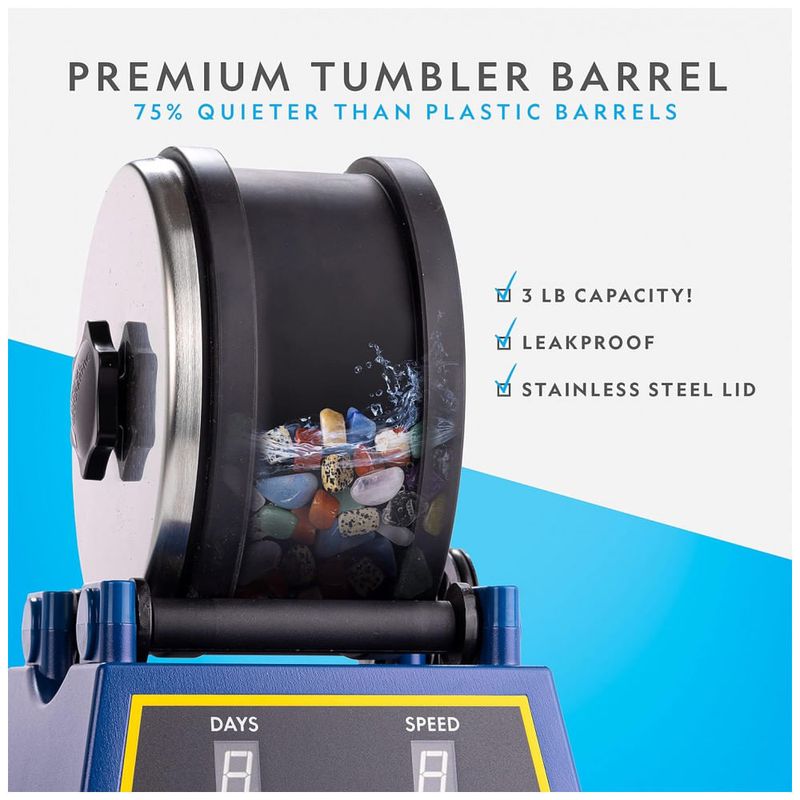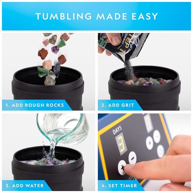 CRIE SUAS PRÓPRIAS PEDRAS GEMAS A queda de rochas é um hobby muito popular para crianças e adultos. Este polidor de rochas profissional torna divertido e fácil transformar pedras ásperas em pedras preciosas lindamente polidas, graças à sua operação simples e design durável.