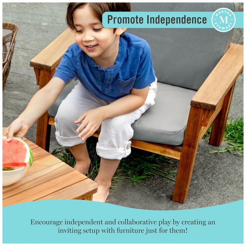 A linha Martha Stewart Kids Outdoor, produzida pela Guidecraft, foi criada para montar ambientes externos infantis aconchegantes, integrando madeira natural, almofadas confortáveis e proporções ergonomicamente adequadas às crianças. A Guidecraft atua há décadas no segmento de móveis infantis e brinquedos educativos, com foco em durabilidade, madeira de qualidade e produtos que estimulam autonomia e uso criativo dos espaços de brincar e aprender.?