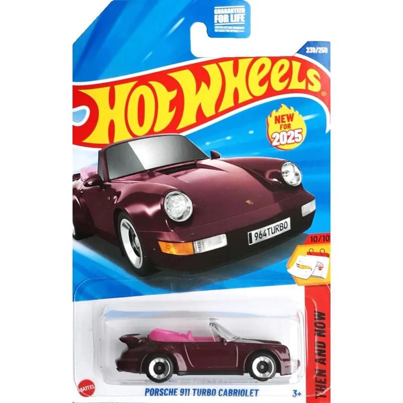 Elegância e velocidade em uma única miniatura! O Hot Wheels Porsche 911 Turbo Cabriolet (964) traz o charme clássico do icônico conversível alemão dos anos 90, com acabamento impecável em vinho metálico e interior em destaque. Um verdadeiro símbolo de luxo e desempenho.\n\nParte da coleção 2025, este modelo é o 239/250 e o 10/10 da série Then and Now, conectando o passado glorioso da Porsche com o design moderno e inconfundível da marca. Ideal para colecionadores exigentes e fãs de superesportivos lendários. Idade recomendada:+3 anos;Composição/Material:Metal;Funciona com pilhas:Não;Brinquedo com luz:Não;Brinquedo com som:Não;Dimensões:16,7x7x20 cm;Peso:0,202 kg;Código de Barras:7898692795006;Garantia do Fornecedor:3 Meses contra defeito de fabricação;