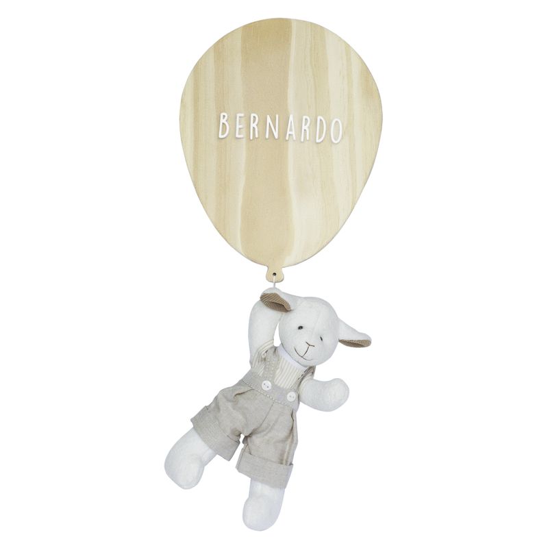 Enfeite em formato de bexiga feito em madeira pinus encerada, o nome do bebê em acrílico fixado na plaquinha e decorado com carneirinho em pelúcia de roupinha.