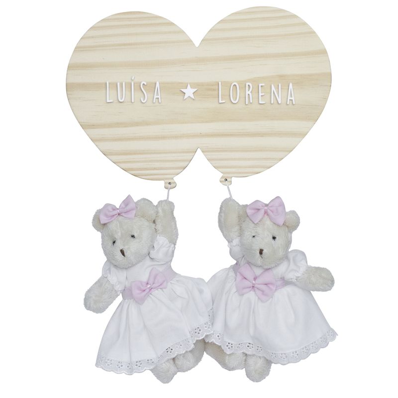 Enfeite em formato de duas bexigas feito em madeira MDF pintada, o nome dos bebês em acrílico fixado na plaquinha e decorado com ursinhas em pelúcia com vestidos.
