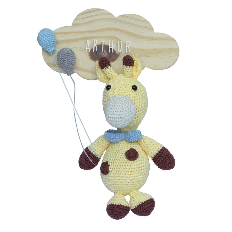 Enfeite em formato de nuvem feito em madeira pinus encerada, o nome do bebê em acrílico fixado na plaquinha e decorado com girafa de gravatinha segurando bexiguinhas amigurumi de croche.