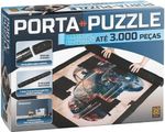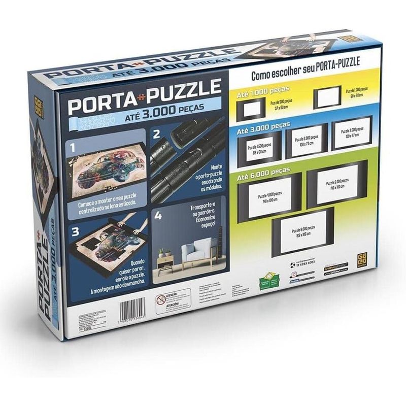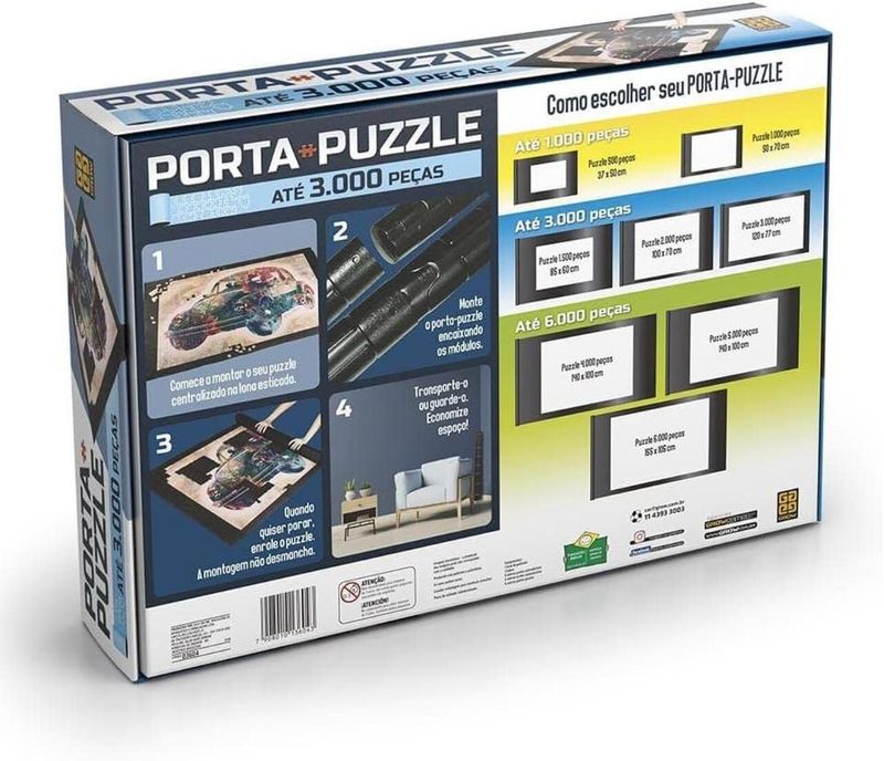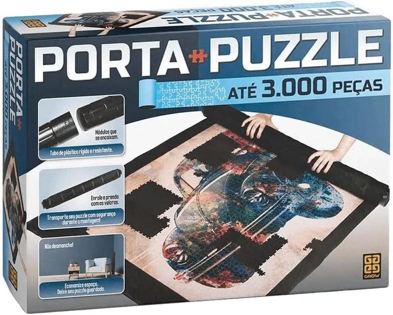 -Um sistema muito prático e ideal para você guardar seu puzzle com segurança durante a montagem até terminá-lo. -Com Porta-Puzzle você pode continuar montando seu puzzle mesmo durante as suas viagens. -Basta enrolar e carregar, sem correr o risco de desmontar ou de perder peças! -Protege as peças contra perda e poeira! Guarde seu puzzle em montagem e leve-o para onde quiser! -Compatível com puzzles Grow até 3000 peças (aproximadamente 78,0 x 120,0 cm) -Tamanho da base 90,0 x 140,0 cm Características: Marca - Grow Cód. 3604 contém: 1 base de tecido (90,0 x 140,0 cm) 3 tubos conjunto de velcros