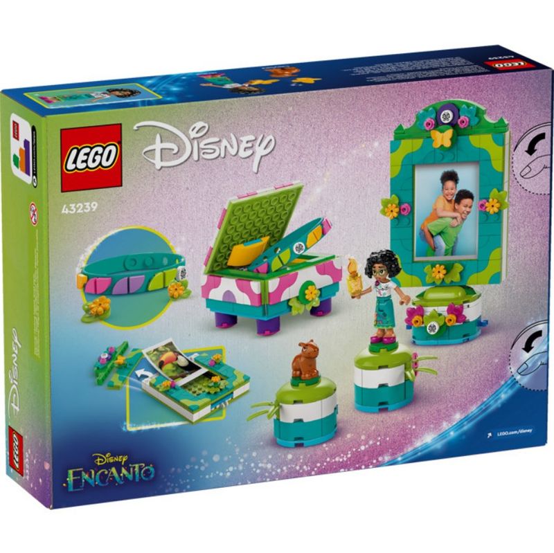 Compartilhe seu amor por Encanto com o Porta-retratos e Porta-joias da Mirabel! Abra este conjunto LEGO® | Disney e crie 3 peças úteis e divertidas: um pequeno porta-joias que pode guardar a pulseira e os elementos para decorá-lo infinitamente, além de um porta-retratos e suporte com clipes adicionais para segurar fotos pequenas. Você pode criar cenas adoráveis com a Mirabel e a capivara e mudar as fotos quando quiser!