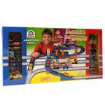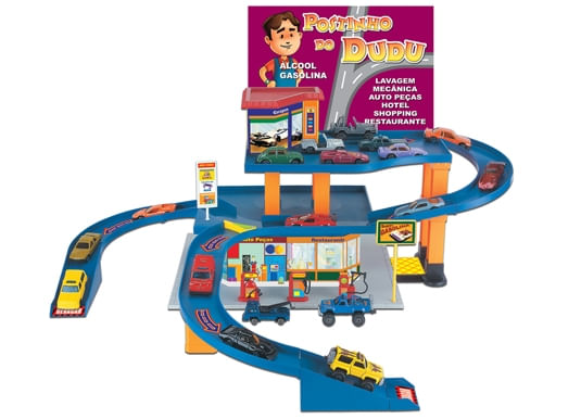 Um super posto de gasolina em dois andares com garagem, restaurante, uma oficina mecânica e já vem com 18 carrinhos de cores variadas.