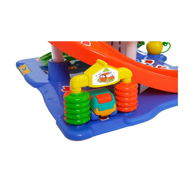 As bombas de combustível possuem botões giratórios que simulam o abastecimento, estimulando o faz de conta e o aprendizado através da brincadeira. O elevador permite que os pequenos levem o carrinho para o estacionamento superior, tornando a experiência ainda mais dinâmica. Para complementar a brincadeira, o conjunto acompanha um carrinho e um guincho.