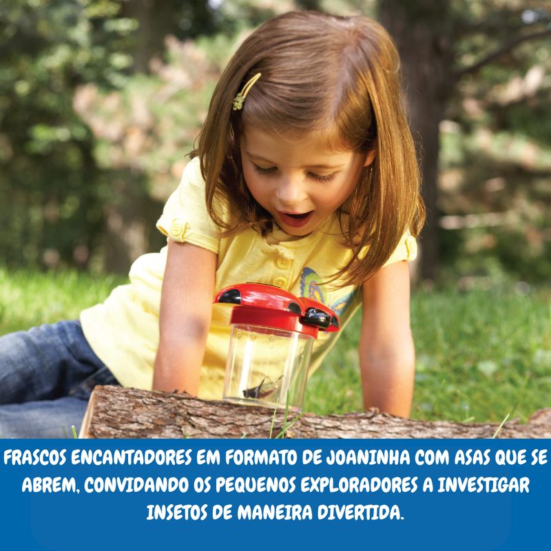 Design em formato de joaninha: As asas se abrem para revelar uma lupa de 3,5x, incentivando a exploração de insetos e outros pequenos seres da natureza.