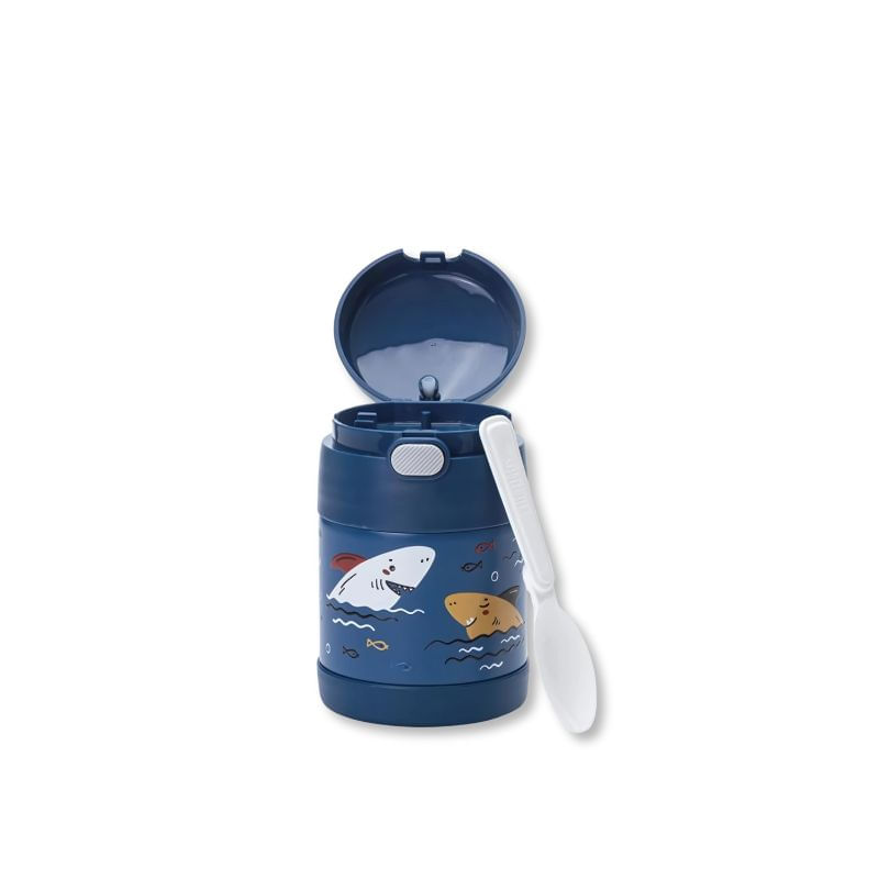 O Pote Térmico Infantil Thermos Funtainer F310 Tubarão- 290 ml de capacidade, combina beleza e funcionalidade para o dia a dia das crianças. Com a exclusiva tecnologia de isolamento a vácuo Thermos, este pote é feito em aço inoxidável com parede dupla, o que garante resistência a quedas, segurança ao toque e durabilidade. A parte externa não esquenta ao toque quando há alimentos quentes e não transpira com alimentos frios, proporcionando conforto e segurança para as crianças. Acompanha colher embutida, pensada para facilitar ainda mais o consumo das refeições. Com design compacto e antivazamento, ele é perfeito para levar à escola, passeios, viagens, ou qualquer momento em que a criança precise de uma refeição prática e saborosa. Além disso, é totalmente livre de BPA, garantindo que o contato com o alimento seja seguro e saudável. ESPECIFICAÇÕES: