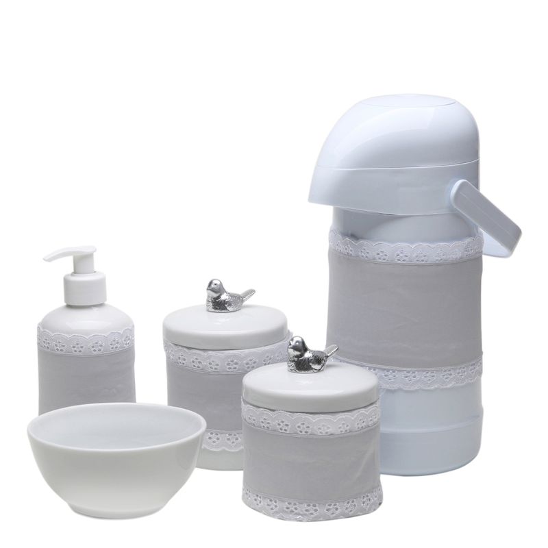 Kit higiene com garrafa térmica e porcelanas brancas decoradas com passarinho prata e capas de tecido.