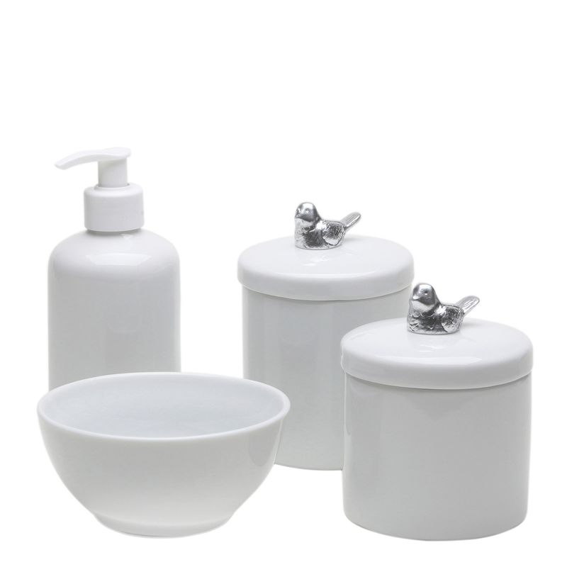 Kit higiene com porcelanas brancas decoradas com passarinho prata.