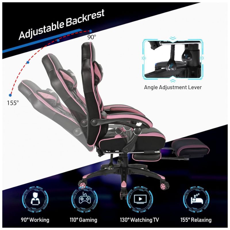 Ajuste à vontade A faixa de ajuste de altura do assento da cadeira de jogos ergonômica é de 43 a , o que pode atender às suas necessidades diárias. A faixa de ajuste do encosto é de 90 graus a 155 graus, que pode ser inclinada para uma posição adequada para trabalhar, assistir TV ou descansar. A cadeira de jogo multifuncional pode melhorar sua experiência de jogo.