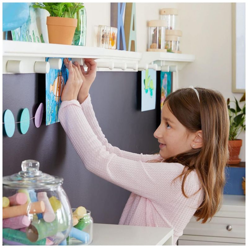 A prateleira expositora Martha Stewart Crafting Kids’ Art Display foi desenvolvida para pendurar e exibir desenhos, pinturas e projetos de arte infantil sem o uso de alfinetes ou tachinhas. O trilho magnético frontal utiliza ímãs fortes para segurar as folhas, permitindo substituir as produções com facilidade e mantendo o material preservado.?