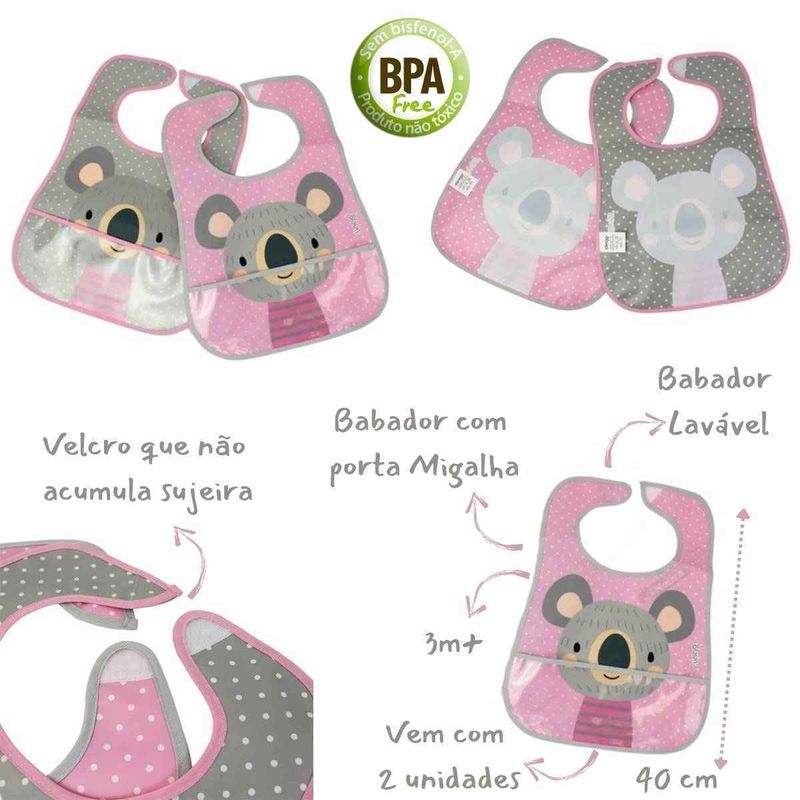 - Babadores: 2 unidades de babador impermeável e com bolso coletor, livre de BPA e lavável.