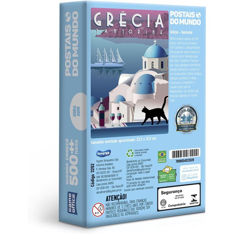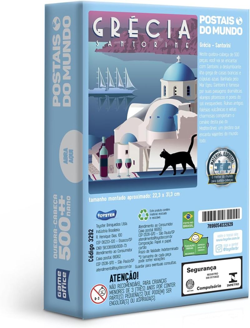Desenvolva a concentração e a percepção visual de forma divertida! Com uma embalagem prática abre e fecha, montar um quebra-cabeça vai muito além de apenas encaixar peças! Ele traz diversos benefícios para o desenvolvimento, tanto para crianças quanto para adultos. Diverte-se montando esse lindo Quebra-cabeça 500 peças nano - Postais do Mundo – Grécia. A Toyster Brinquedos, referência em qualidade e criatividade, garante a segurança do seu pequeno com certificação do Inmetro. Material: Papel cartonado e papel cartão