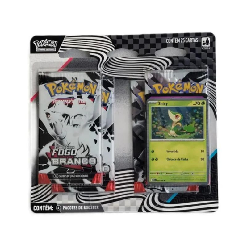 O Blister Quádruplo Snivy – Fogo Branco e Raio Preto é uma edição especial da coleção Pokémon TCG: Escarlate e Violeta EV10.5, ideal para colecionadores e jogadores que desejam explorar a região de Unova:Contém 4 pacotes de booster:2 boosters da coleção Raio Preto2 boosters da coleção Fogo BrancoInclui 1 carta holográfica promocional do Pokémon inicial SnivyAcompanha 1 carta codificada para desbloquear conteúdo no Pokémon Estampas Ilustradas LiveTotal de 25 cartas no formato padrão 63 mm x 88 mmProduto lacrado e original, em portuguêsRecomendado para maiores de 3 anosExplore Unova com 156 Pokémon diferentes e monte seu Pokédex regional com os parceiros iniciais Snivy, Tepig e Oshawott!\n\nIdade recomendada:8-13 anos;Composição/Material:Papel;Funciona com pilhas:Não;Brinquedo com luz:Não;Brinquedo com som:Não;Dimensões:18,7x19x2 cm;Peso:0,084 kg;Código de Barras:7896192358981;Garantia do Fornecedor:3 Meses contra defeito de fabricação;
