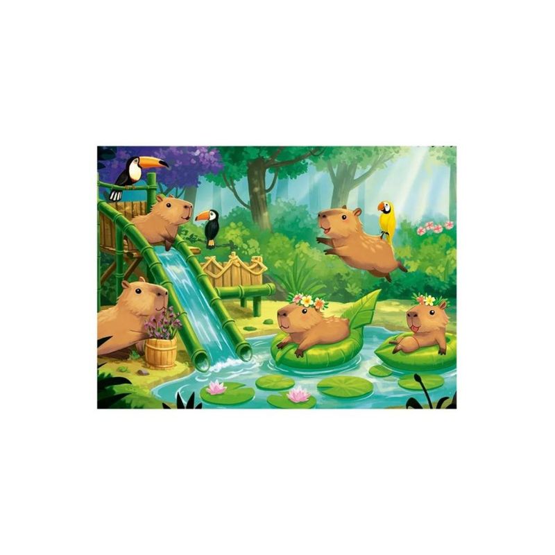 Quebra-cabeça 100 peças Capivara Club Mergulhe em uma cena mágica e cheia de alegria com este quebra-cabeça de 100 peças! A imagem encantadora mostra um grupo de capivaras se divertindo em um parque natural, rodeadas por tobogãs de bambu, folhas flutuantes e amigos coloridos como tucanos e araras. Com cores vibrantes e detalhes fofos, este quebra-cabeça estimula a imaginação e desenvolve o raciocínio lógico de forma divertida. Ideal para crianças e adultos que amam natureza, animais e momentos de descontração em família! Tamanho da imagem : 36,3 x 26,4 cm Idade recomendada: a partir de 6 anos Monte peça por peça e descubra a beleza dessa floresta encantada!