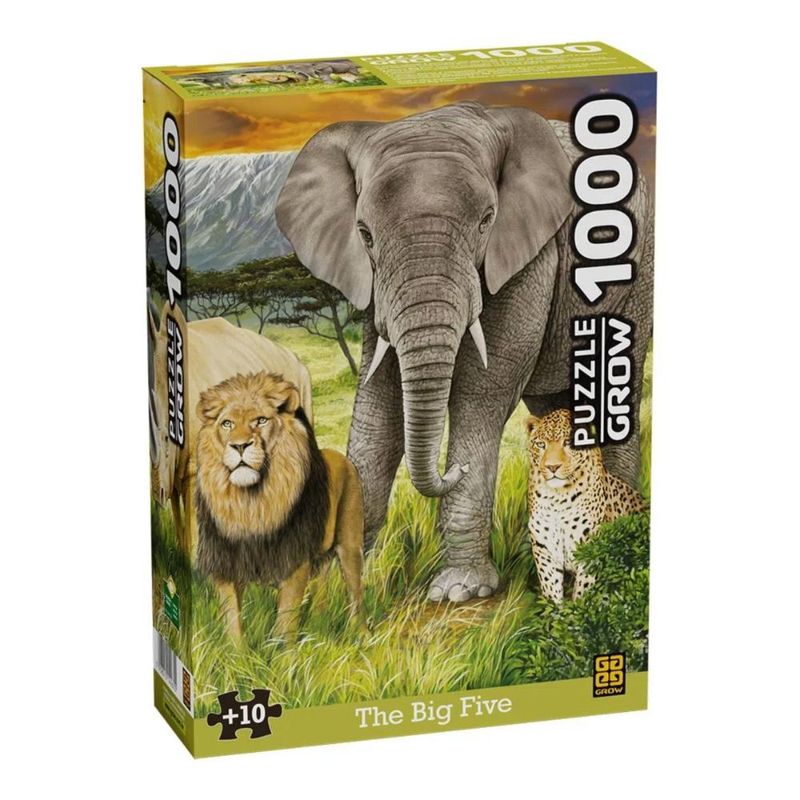 O reino animal é formado por seres de todos os tamanhos, mas é inegável que aqueles conhecidos por sua força e poder se destacam. O termo Big Five nasceu no século 19 e já há algum tempo o turismo na África colabora para conscientizar cada vez mais a relação entre humanos e animais. O grupo seleto é integrado pelos astros da selva que vemos na imagem: rinoceronte, búfalo leopardo, elefante e Leão. Cada um possui características diferentes e fãs pelo mundo todo. Qual o seu preferido? Monte quebra-cabeça e tenha um raro encontro de todos os Big Five! A partir de 10 anos Quantidade de peças: 1008 Dimensões aproximadas: 50 x 70 cm Dicas para montagem: 1. Confira o número de peças com a informação existente na embalagem. 2. Providencie uma base (papelão ou madeira) um pouco maior que a imagem a ser montada. As dimensões da imagem podem variar em até 1%. 3. Separe as peças com cantos retos e monte, sobre a base, toda a borda da imagem a ser montada. 4. Separe as demais peças, agrupando-as pelas cores, para facilitar a sua localização. 5. Quando chegar a uma área com muitas peças da mesma cor, separe-as pelo formato. 6. Mantenha o quebra cabeça em lugar plano, enquanto estiver fazendo a montagem. 7. Depois de montar, certifique-se de que todas as peças estão bem encaixadas, e nos lugares corretos.