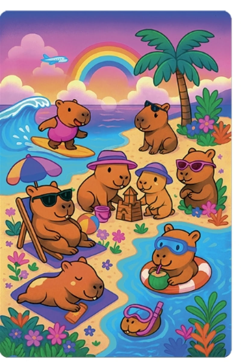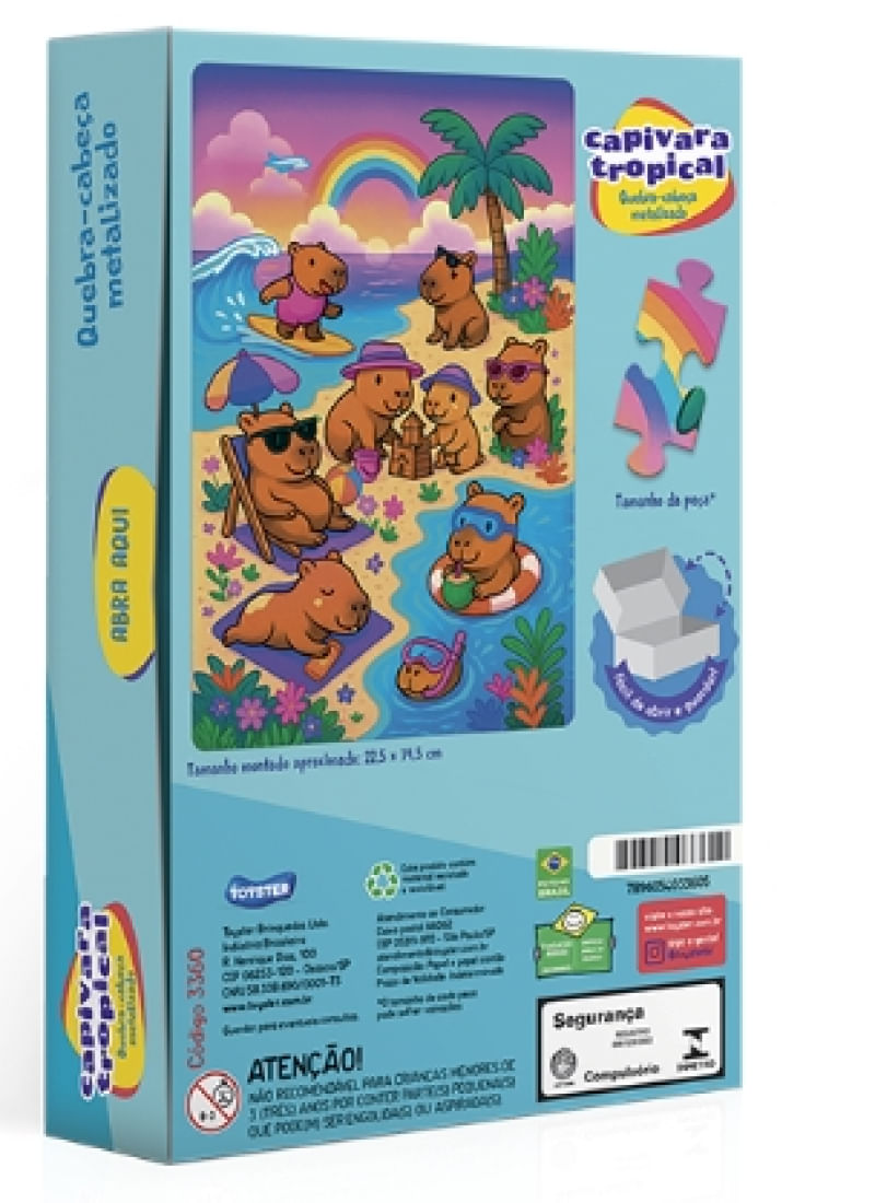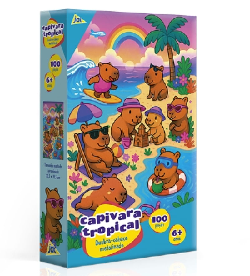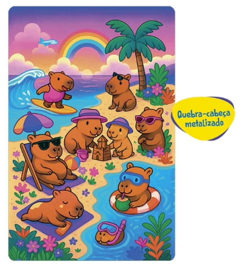 QUEBRA CABEÇA 100 PC ENCAPADO - CAPIVARA TROPICAL METALIZADO Sol, areia e muitas capivaras curtindo a vida à beira-mar! Com 100 peças e um brilho especial metalizado, este quebra-cabeça é pura diversão. Ideal para crianças a partir de 6 anos, estimula a coordenação motora, o foco e a criatividade em cada montagem!