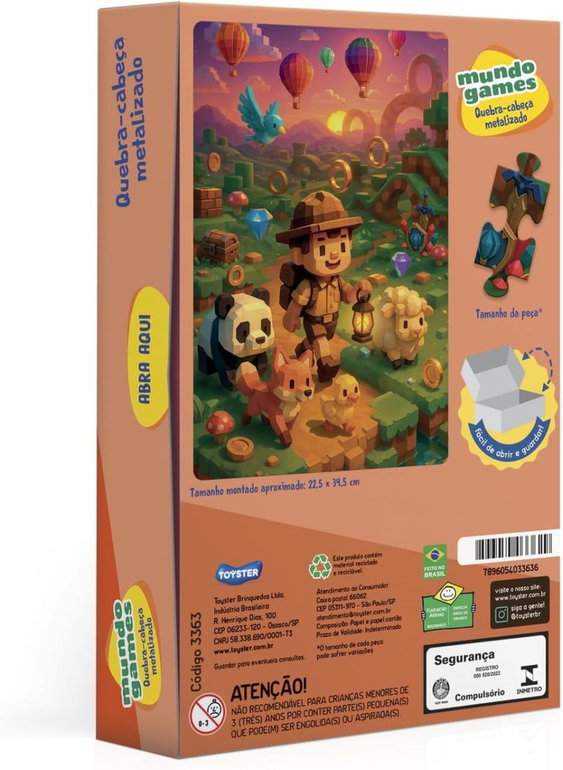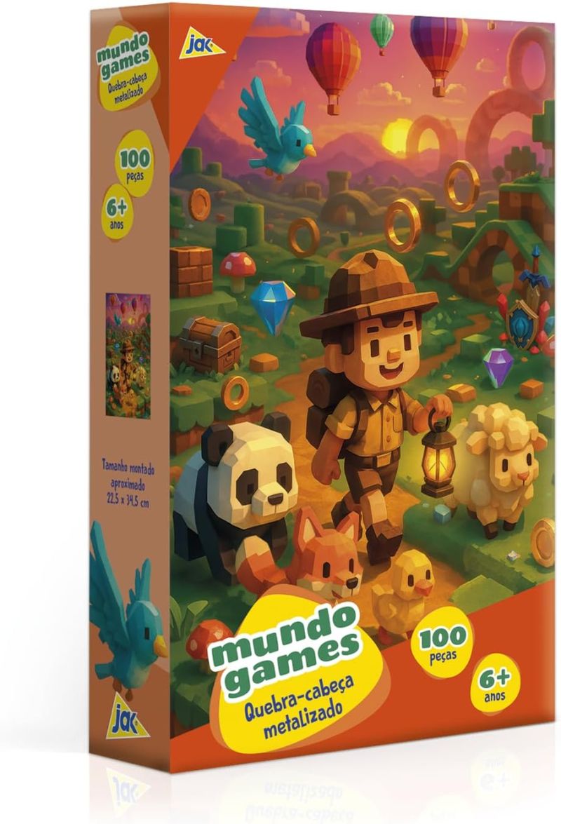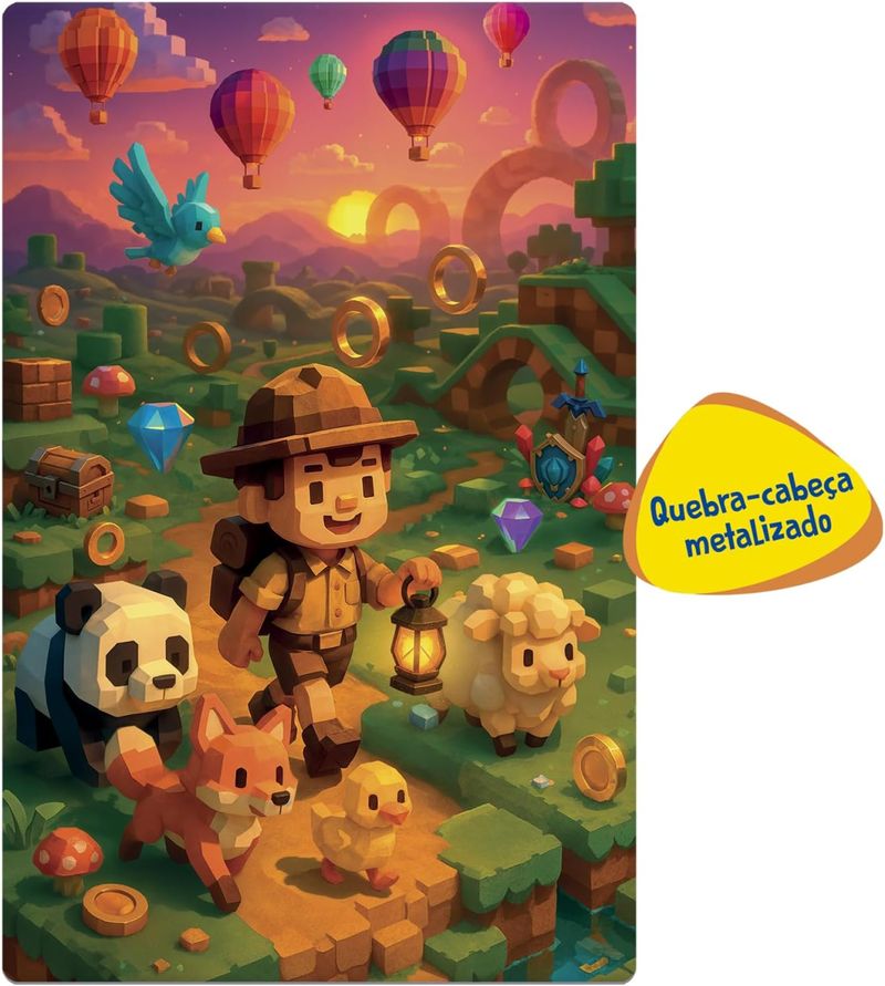 Um Cenário Pixelado Cheio de Cores, Animais Simpáticos e Um Explorador Pronto para Descobrir Novos Caminhos! com 100 Peças e Detalhes Metalizados Brilhantes, Este Quebra-Cabeça É Ideal para Crianças a Partir de 6 Anos. Estimula a Coordenação Motora, o Foco e a Diversão em Cada Montagem!