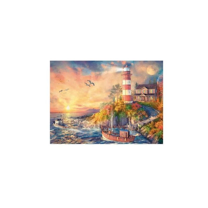 Deixe-se levar pela calmaria do entardecer com este quebra-cabeça que parece uma pintura viva. A imagem retrata um farol à beira-mar, iluminado pelos últimos raios dourados do pôr do sol, guiando com firmeza os barcos que retornam para casa ao cair da noite.