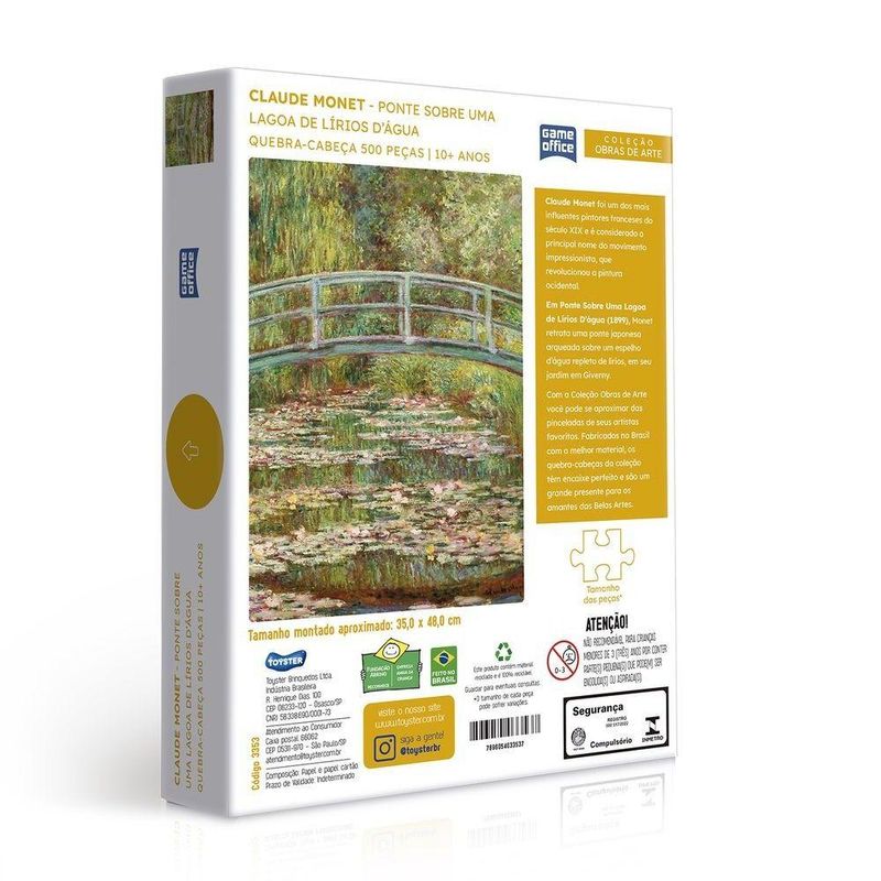 Marca: Toyster;Nome do produto: Quebra-cabeça 500 Peças Ponte Sobre Uma Lagoa Lírios;Idade recomendada: A partir de 10 anos;Selo Inmetro: 000517/2022;Contém: 500 peças.