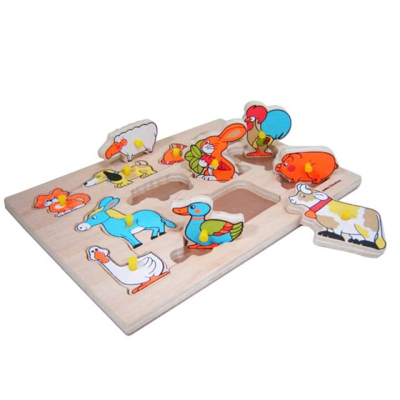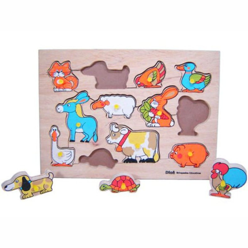 Placa de madeira com 12 figuras de bichos recortadas com pinos fixos que facilitam o encaixe. Estimulam a criança a relacionar e encaixar a figura correta com o recorte da placa.