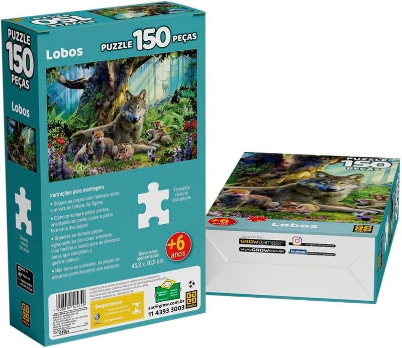 - Um lindo quebra-cabeça com uma imagem de diveros Lobos na natureza. - Mais que um passatempo divertido, os quebra-cabeças desenvolvem o raciocínio, relaxam e se transformam num autêntico hobby. Características: Marca - Grow Cód. 4564 Quantidade de peças - 150 Peças Tamanho do Quebra Cabeça montado - 45,3 x 30,5 Cm Material - Papel Cartão Idade - A partir de 6 Anos Orientação - Horizontal Não é recomendado para menores de 3 anos