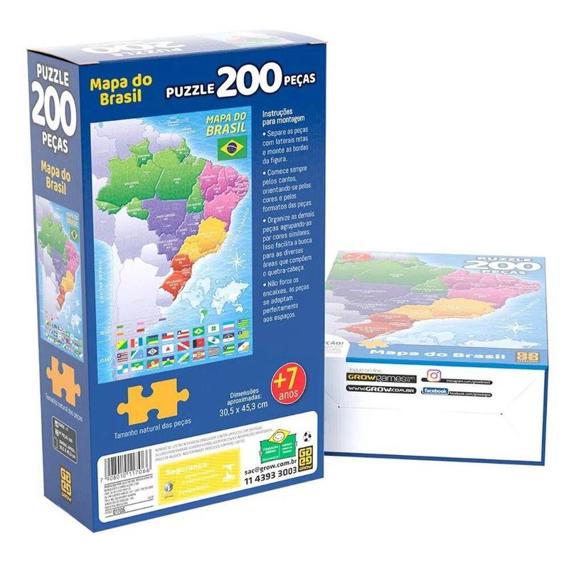 Quebra Cabeça Mapa do Brasil 200 Peças - Grow 3936 Não deixe de brincar e se divertir com este quebra-cabeça! São 200 peças, para você encaixar uma a uma até formar uma incrível imagem do mapa do Brasil, para aprender um pouco mais sobre nosso território e estados. Mais que um passatempo divertido, os quebra-cabeças desenvolvem o raciocínio, relaxam e se transformam num autêntico hobby. Mais que um passatempo divertido, os quebra-cabeças desenvolvem o raciocínio, relaxam e se transformam num autêntico hobby. Quantidade de peças: 200