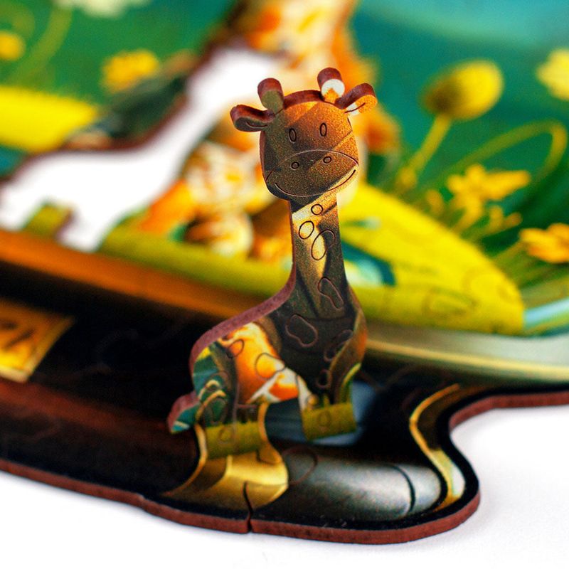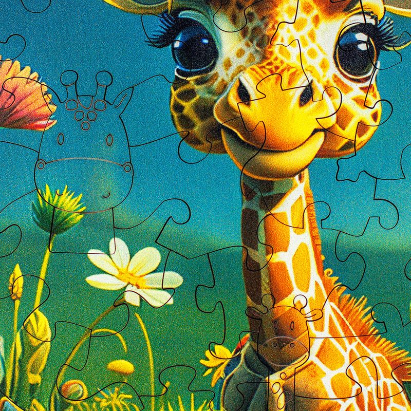 Neste quebra-cabeça, a criança descobre o universo calmo e encantador dessa girafa especial. Entre as peças temáticas, surgem formas que representam a Graça e seu habitat, criando uma conexão suave e envolvente com o personagem.