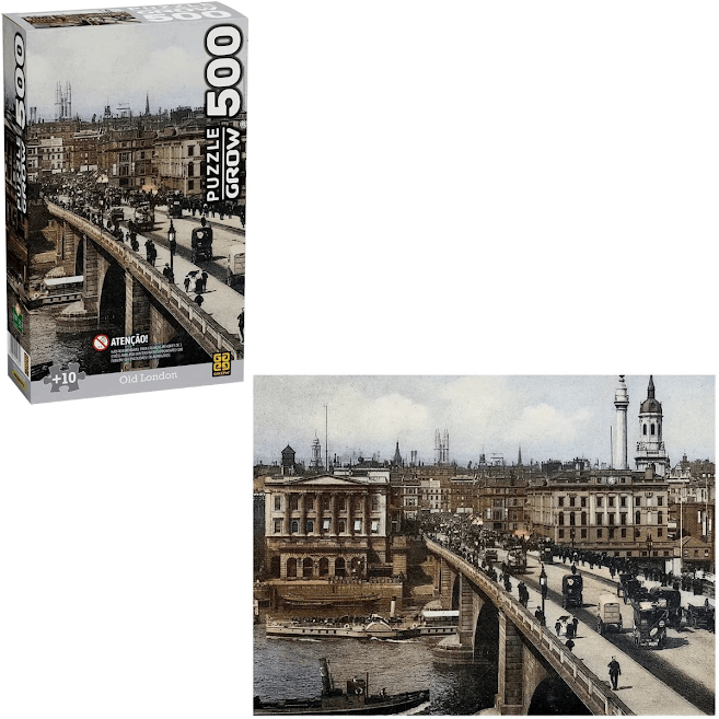 A Grow é pioneira e referência em quebra-cabeças no Brasil, desde 1977. Os melhores materiais são cuidadosamente selecionados sempre buscando qualidade para garantir um encaixe preciso e uma ótima experiência de montagem. Além de um excelente passatempo, de juntar a família e de melhorar a concentração, os Puzzles Grow se tornam lindos objetos de decoração. Tão bela quanto a cidade atual, a antiga Londres ficou sendo conhecida por um charme adorável e pelo crescimento entre os séculos XVIII e XX. A revolução industrial fez com que muitos ingleses deixassem a zona rural, o que colaborou para o crescimento urbano da capital. Durante a Segunda Guerra Mundial, Londres sofreu com os ataques aéreos alemães, recuperando-se nos 10 anos seguintes tornando-se a cidade que conhecemos hoje: moderna, superdesenvolvida e com uma cultura de dar inveja. Volte no tempo e siga a pontualidade britânica na montagem dessa linda imagem de Old London!