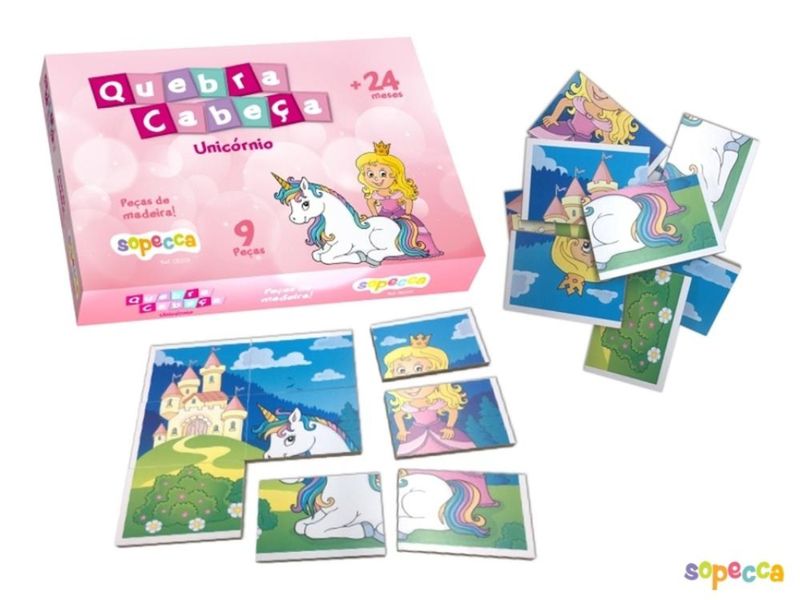 AVISO: Imagens meramente ilustrativas!! Um lindo quebra-cabeça Princesa e unicórnio que as meninas vão amar! Ideal para as crianças iniciarem suas atividades de percepção, fácil de montar e resistente. O quebra cabeça tem 9 peças, é bem colorido e divertido de montar. Mais que um passatempo divertido para toda família, os quebra-cabeças desenvolvem o raciocínio, coordenação motora e promovem a interação entre crianças Marca: Sopecca Personagem: Princesa e Unicórnio Referência: QB209 Quantidade de peças: 9 Peças Material base: Madeira MDF 6mm Tamanho de Cada Peça: 16x4cm Idade Recomendada: a partir de 24 meses