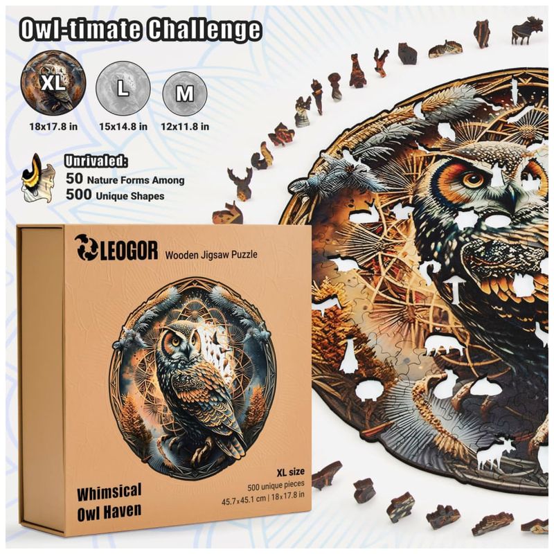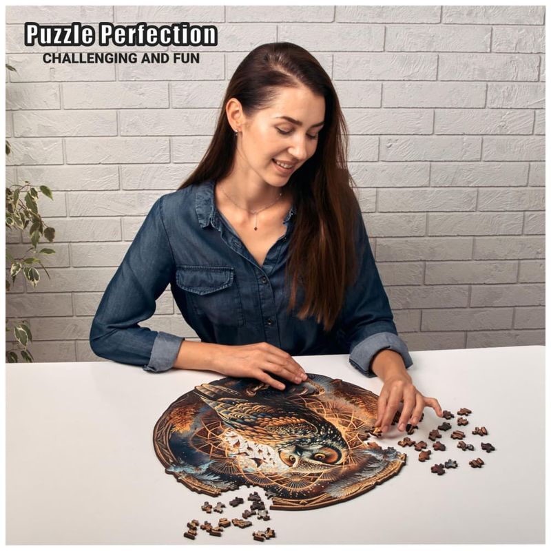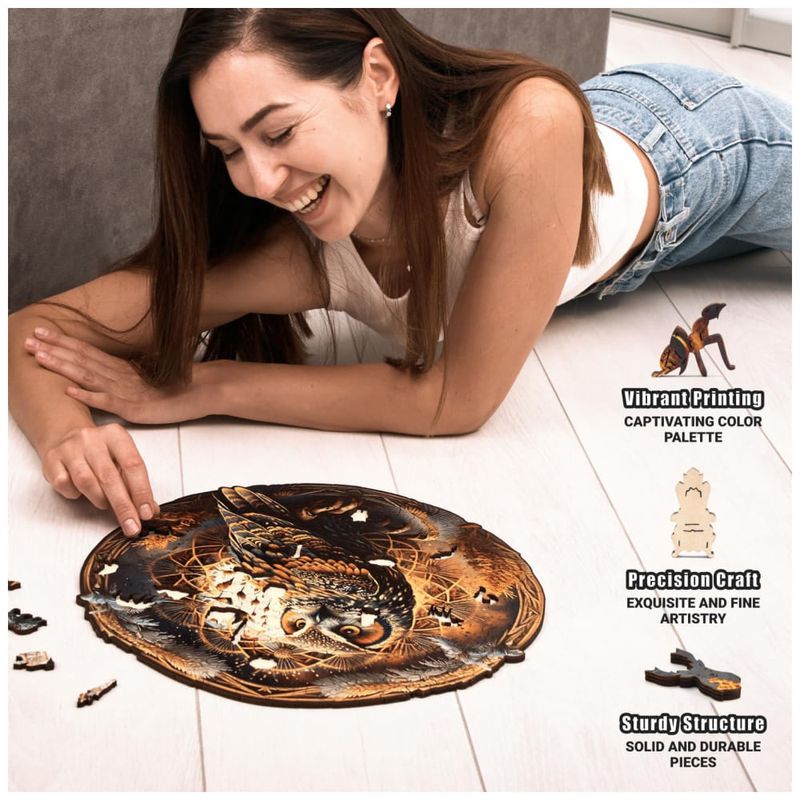 Este quebra cabeça de madeira é uma aventura emocionante, com uma imagem de coruja misteriosa e desafiadora. É uma atividade divertida que une pessoas em harmonia, combinando a fantasia da natureza com a alegria de resolver um quebra cabeça.