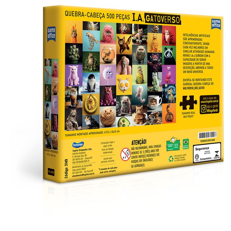 Nossos quebra-cabeças têm um padrão internacional de qualidade com encaixe suave que pode ser sentido em cada peça! Montar um Quebra-Cabeça é mais do que separar peças, é um desafio estimulante e prazeroso. Os quebra-cabeças desenvolvem o raciocínio lógico. Inteligências artificiais são aprimoradas constantemente, sendo cada vez melhores em simular atividades humanas. Novas I.A.s surgem com a capacidade de gerar imagens a partir de uma descrição, abrindo a todos um novo universo! Divirta-se montando este surreal quebra-cabeça do multiverso dos gatos! Recomendado: a partir de 10 anos. Material composição: Papel cartonado, papel cartão. Garantia do Fabricante: 03 meses contra defeitos de fabricação. Aviso: Imagens meramente ilustrativas. As cores podem variar entre as imagens mostradas acima e o produto.