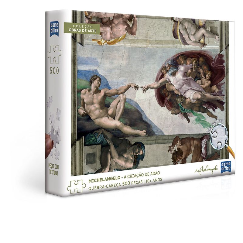Aproxime-se das cores de Michelangelo com esse quebra-cabeça de 500 peças da Coleção Obras de Arte! Temos um padrão internacional de qualidade e encaixe suave que pode ser sentido em cada peça! Material: papel e papel cartão. Certificação Segurança: Selo Inmetro. Garantia do Fabricante: 03 meses contra defeitos de fabricação. Aviso: Imagens meramente ilustrativas. As cores podem variar entre as imagens mostradas acima e o produto.