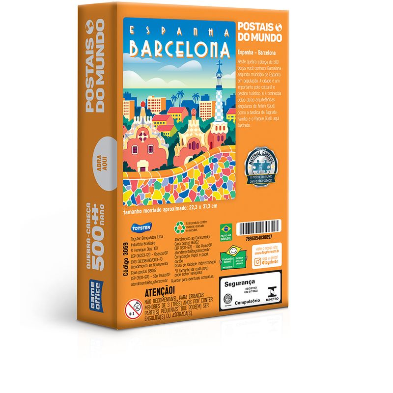 Nossos quebra-cabeças têm um padrão internacional de qualidade com encaixe suave que pode ser sentido em cada peça! Montar um Quebra-Cabeça é mais do que separar peças, é um desafio estimulante e prazeroso. Os quebra-cabeças desenvolvem o raciocínio lógico. Desafie suas habilidades com esse incrível quebra-cabeça nano de 500 peças "Postais do Mundo" apresenta ilustrações de belas paisagens ao redor do globo. Recomendado: a partir de 10 anos. Material composição: Papel cartonado, papel cartão. Certificação Segurança: Selo Inmetro. Garantia do Fabricante: 03 meses contra defeitos de fabricação. Aviso: Imagens meramente ilustrativas. As cores podem variar entre as imagens mostradas acima e o produto.