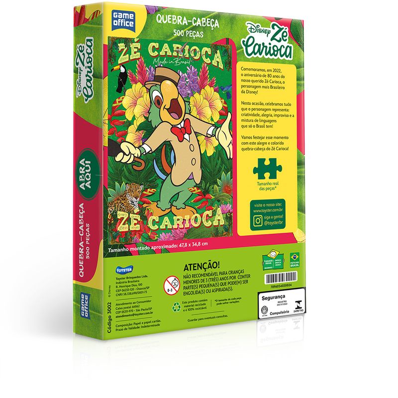 Quebra-cabeça de 500 peças em comemoração do aniversário de 80 anos do nosso querido Zé Carioca, o personagem mais brasileiro da Disney! Temos um padrão internacional de qualidade e encaixe suave que pode ser sentido em cada peça! Itens Inclusos: Quebra-cabeça 500 peças. Produto montado: aproximadamente A 47,8 X L 34,8. Recomendado: Recomendável para crianças a partir de 10 anos. Material composição: Papel cartonado, papel cartão. Certificação Segurança: Selo Inmetro CE-BRI/IQB - 002320 NM 300/2002 - OCP 006 - REGISTRO:000517/2022. Garantia do Fabricante: 03 meses contra defeitos de fabricação.