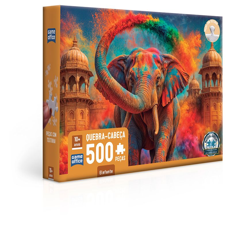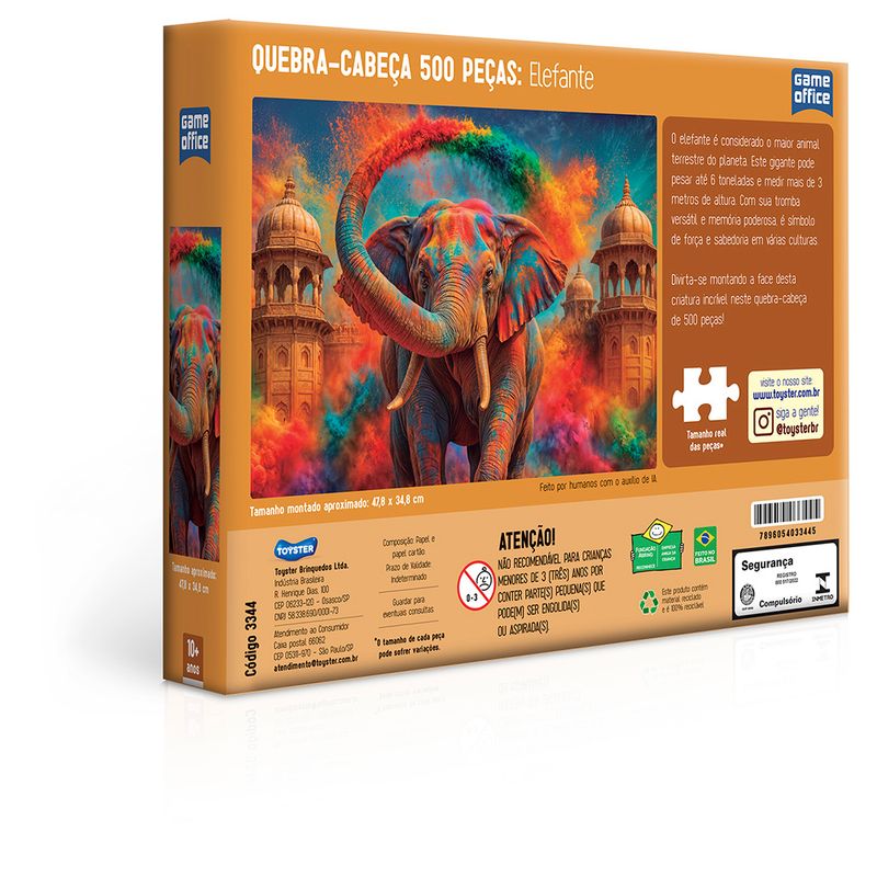 Quebra-cabeça de 500 peças para você montar o elefante. Temos um padrão internacional de qualidade e encaixe suave que pode ser sentido em cada peça! Material: papel e papel cartão. Certificação Segurança: Selo Inmetro. Garantia do Fabricante: 03 meses contra defeitos de fabricação. Aviso: Imagens meramente ilustrativas. As cores podem variar entre as imagens mostradas acima e o produto.