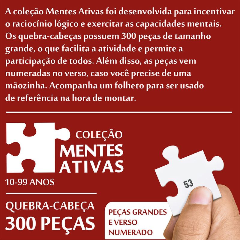 Quebra-cabeça de 300 peças, com peças grandes e resistentes que facilita a montagem ajudando você a exercitar sua mente. Mantenha sua mente ativa montando o quebra-cabeça. Material: papel e papel cartão. Certificação Segurança: Selo Inmetro. Garantia do Fabricante: 03 meses contra defeitos de fabricação. Aviso: Imagens meramente ilustrativas. As cores podem variar entre as imagens mostradas acima e o produto.