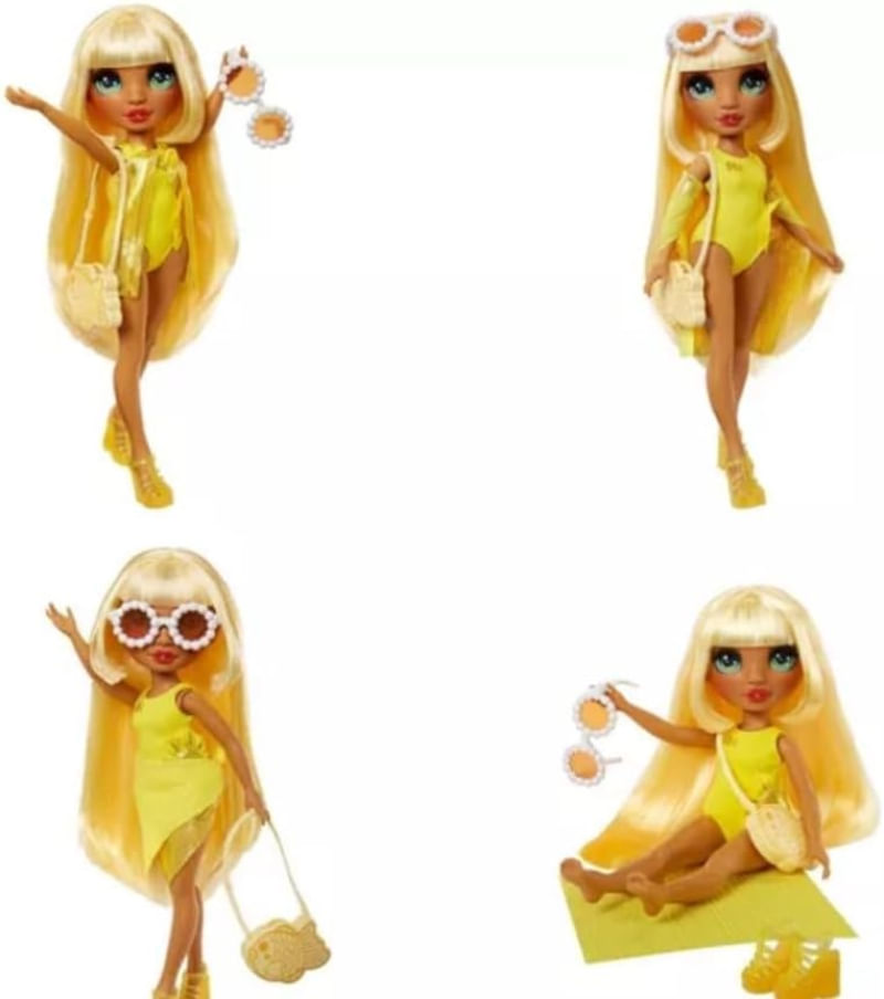 DIVERSÃO SOB O SOL OU EM QUALQUER LUGAR: Sunny está pronta para um dia de diversão com os amigos em seu adorável maiô amarelo, sandálias amarelas, óculos de sol e bolsa combinando, ótimo para a piscina, brincadeiras no banho ou qualquer lugar que sua imaginação o leve.