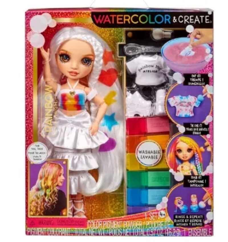 Bonecas DIY de Alta Aquarela e Criar Moda Arco-íris inspiram a criatividade. Aquarela e criação tornam tão fácil projetar sua própria boneca Rainbow High personalizada de tantas maneiras diferentes, até mesmo Tie-Dye! Você pode até usar as aquarelas laváveis em seu próprio cabelo! Então, basta enxaguar e repetir e fazer tudo de novo.