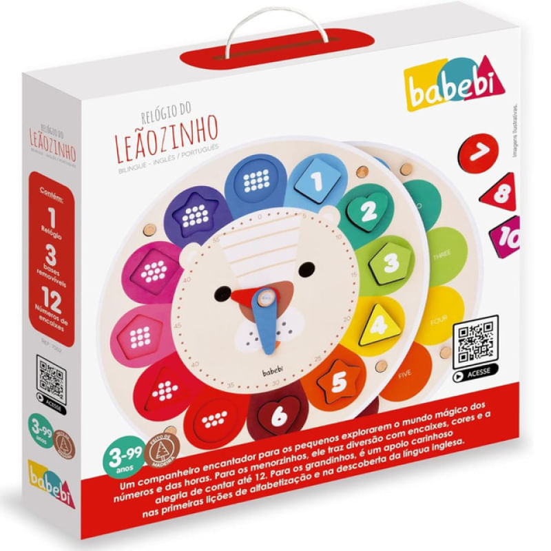 O "Relógio do Leãozinho" é um brinquedo educativo bilíngue (Português e Inglês) que ajuda as crianças a aprenderem as horas de maneira divertida e interativa.