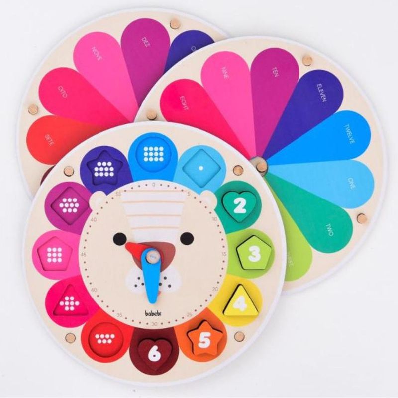 Com peças coloridas e removíveis, este relógio também ensina números e cores, tornando o aprendizado uma brincadeira.