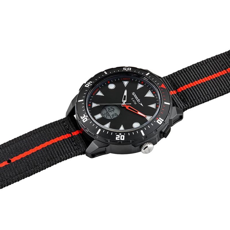 Características: com caixa em Policarbonato Preta e pulseira em tecido preto/vermelho