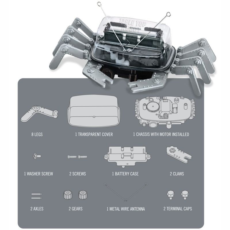 Conteúdo da embalagem: 8 pernas, 1 capa transparente, 1 chassi com motor instalado, 3 parafusos, 1 caixa de bateria, 2 engrenagens, 2 eixos, 2 garras, 1 antena metálica, 2 pinos conectores.