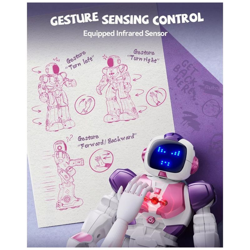 O robô dançante Ruko 6088 rosa e roxo é um brinquedo eletrônico interativo indicado para crianças de 3 a 6 anos, com corpo em plástico ABS, acabamento liso e bordas arredondadas para manuseio infantil. Ele permite controle por gestos, controle remoto e aplicativo, possibilitando comandar movimentos de avanço, recuo, curvas, caminhada e deslizamento, além de executar rotinas de canto e dança com animações em LED no “rosto” do robô.